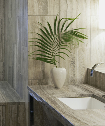 depending on the desired effect. Typically available in a honed or antiqued finish, the stone can have a look anywhere from contemporary to old-world. Travertine is widely used for flooring, shower walls, fireplaces and kitchen